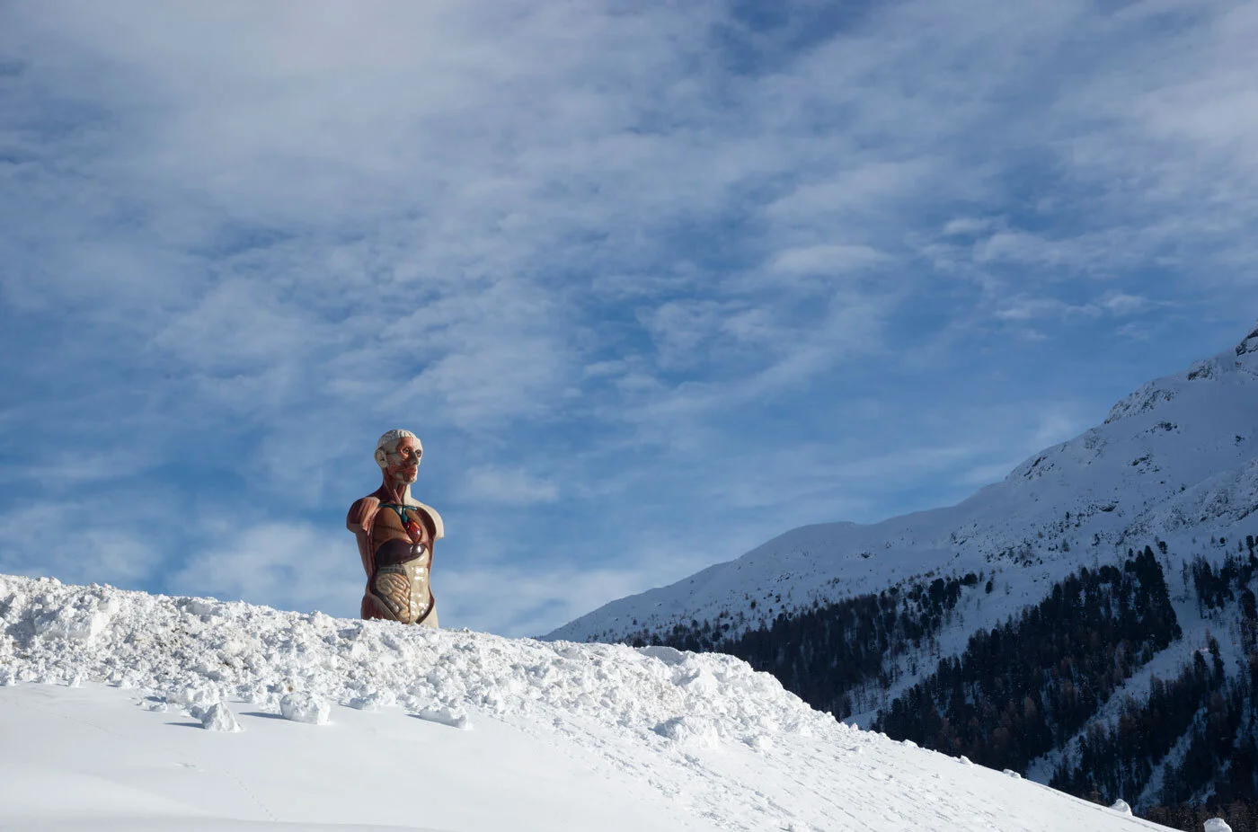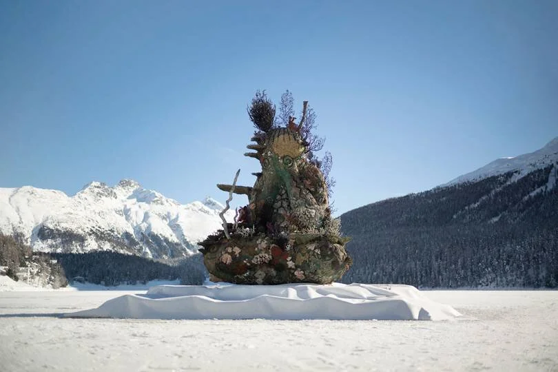 Damien Hirst installs giant sculpture in middle of frozen St. Moritz Lake.
